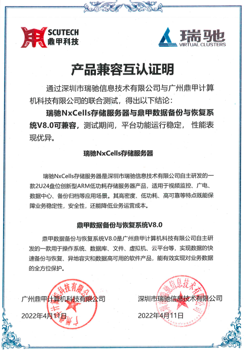 近日,鼎甲科技與瑞馳完成產(chǎn)品兼容互認(rèn)證。本次兼容性互認(rèn)證經(jīng)瑞馳與鼎甲科技雙方聯(lián)合測(cè)試得出:瑞馳NxCells存儲(chǔ)服務(wù)器與鼎甲數(shù)據(jù)備份與恢復(fù)系統(tǒng)V8.0可兼容,測(cè)試期間,平臺(tái)功能運(yùn)行穩(wěn)定,性能表現(xiàn)優(yōu)異。