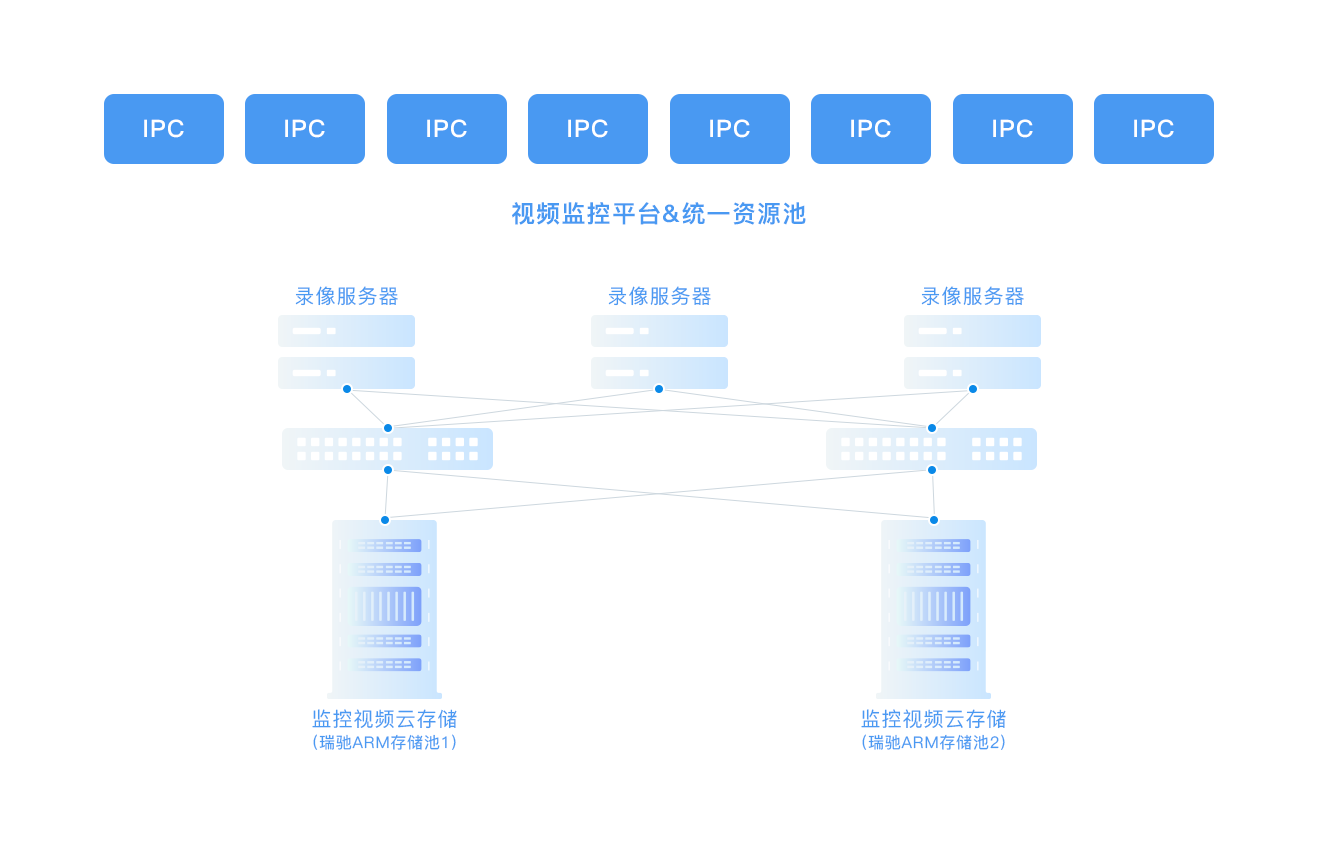 瑞馳提供業(yè)界創(chuàng)新的微集群視頻存儲解決方案,項目通過部署多臺Nxcells高密度低功耗分布式存儲,與X86機(jī)頭服務(wù)器結(jié)合,組成“冷+熱”存儲池。“冷池”中每5個NxCell存儲刀片作為一個“微集群”。視頻寫入冷池時,僅部分“微集群”是活躍的,剩下的不活躍的微集群則處于硬盤休眠狀態(tài),這樣大幅節(jié)省功耗并提高硬盤壽命。一個微集群寫滿,即進(jìn)入休眠狀態(tài),下一個微集群被喚醒…… 此方案既滿足視頻云大容量存儲,又保障前端數(shù)千上萬路攝像頭的正常寫入。高密度低功耗Nxcells存儲比X86服務(wù)器降低50%的運營電力消耗,為企業(yè)節(jié)約機(jī)柜租賃設(shè)備維護(hù)費用可達(dá)40%。