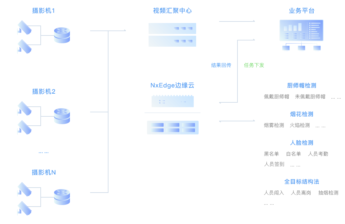 瑞馳給合作伙伴提供AI邊緣終端和邊緣計(jì)算服務(wù)器,基于Ai視覺算法,通過攝像頭自動(dòng)識(shí)別后廚員工的行為,如:在離崗、抽煙打電話、是否佩戴廚師帽、是否戴口罩、區(qū)域入侵等異常行為進(jìn)行自動(dòng)識(shí)別,有效提高后廚監(jiān)管效率,保障食品安全。